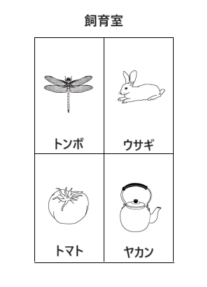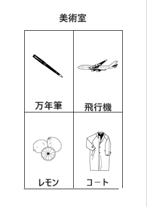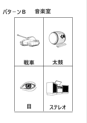 - Bパタ-ンは学校の実習室をイメ-ジする。1枚目が音楽室の様子、2枚目が飼育室の様子、3枚目が美術室の様子、4枚目が工作室の様子を頭に描く。