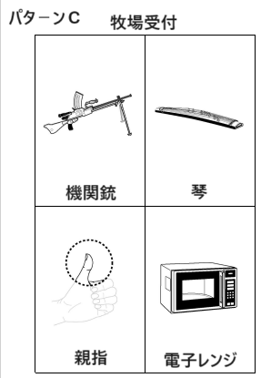 - Cパタ-ンは牧場の風景をイメ-ジする。1枚目が牧場受付の様子、2枚目が牛舎の様子、3枚目が牛舎前の風景、4枚目が牧場家を頭に描く。4枚のイラストが牛で繋がっている。