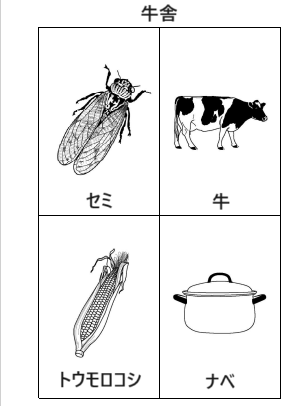 - 牛舎では、指を使って牛の乳を搾っている。鍋で煮たトウモロコシを牛に与えていると、セミが牛に止る。