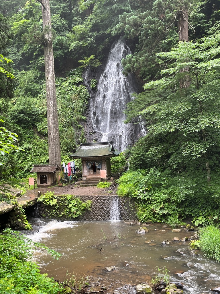 ここで宿に帰るつもりだったが、初めて訪れた者がいたので、3人が石段2,446段を下り随神門まで足を延ばすことにした。表参道は杉木立に囲まれ、雨に濡れていたため風情があった。私を含めた2人は車で随神門まで迎えに行く。私達は随神門から7つの神社の祠がある一角まで継子坂の石段を下り、そこを右折して赤い神橋に至る。そこで須賀の滝を見学し、更に祓川を渡り滝近くまで行く。梅雨時期で水量が多く見ごたえがあった。