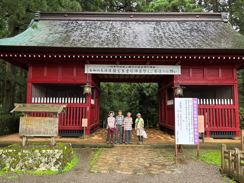 更に爺杉、国宝五重塔まで行くと、3人と合流した。国宝五重塔は令和5年(2023年)5月上旬から令和7年(2025年)春頃まで屋根改修工事のため、工事の足場や幕などにより五重塔はすっかり覆われていた。参拝だけは可能だった。五重塔から引返して随神門に戻り、記念写真を撮る。