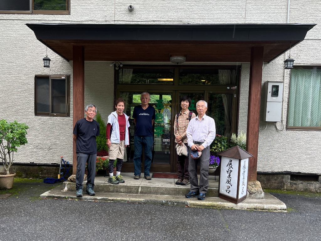 往路で強風にあったガレ場は相変わらず勢いが衰えて無く、足元が悪いこともあり転倒しそうになる。雪渓を横断すると、整備された登山道を水たまりを避けながら、月山登山口まで一気に下る。先行していた二人は周回コースを経て月山八合目登山口に戻る。我々は往路と同じ木道を引返し、月山八合目登山口に少し先着する。月山八合目駐車場は更にガスが濃くなっていた。車の走り始めは殆どホワイトアウト状態で、ノロノロ運転が暫く続く。今夜の宿の志津温泉五色亭は月山八合目から月山を反時計回りに半周する形で進む。県道211号から庄内こばえちゃラインに入り、更に国道112号を経て、73km程を1時間33分で志津温泉湖畔の宿五色亭に到着する。志津温泉から行ける月山スキ-場は夏スキ-知られているが、志津温泉付近は冬季4m以上の積雪に達するそうです。