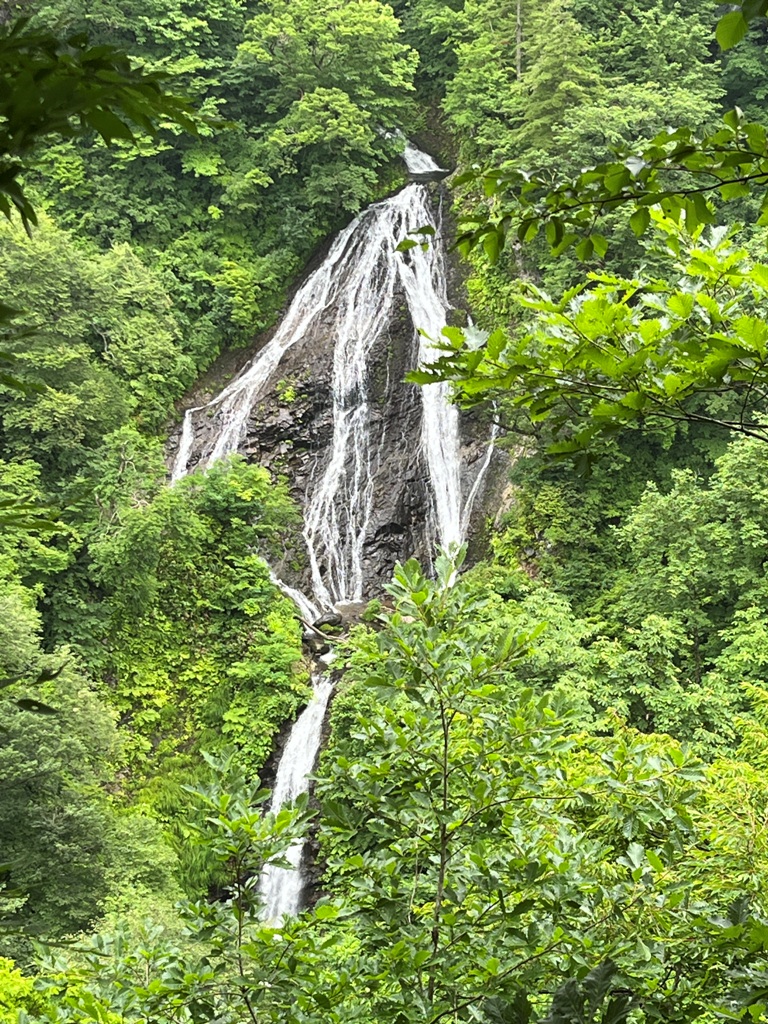帰路は湯殿山大駐車場から国道112号に出るため、道中にある七ツ滝公園に寄り道する。七ツ滝は日本の滝百選で、高さは90m、落差は上方50m、下方40mある。上方の幾筋にも分かれた流れが、下方で一本の流れとなって滝壺に落ちる。そこから国道112号に出て、帰路途中にある月山湖にある寒河江ダムを見る。生憎月山大噴水は見ることが出来なかった。すべての予定を終え、同行者を山形空港とさくらんぼ東根駅に送る。そこから自宅までの長い道のりが始まる。安曇野までは東根から荒川胎内ICまで殆ど一般道で、荒川胎内ICから安曇野まで高速道となり、450kmの距離で6時間程かかる。往路は飯豊町から山形市街を通って東根に行ったが、復路は東根から朝日町、白鷹町を通って飯豊町に出る。結局自宅とさくらんぼ東根駅間は休憩を含めて往路6時間16分、復路6時間41分を要す。
