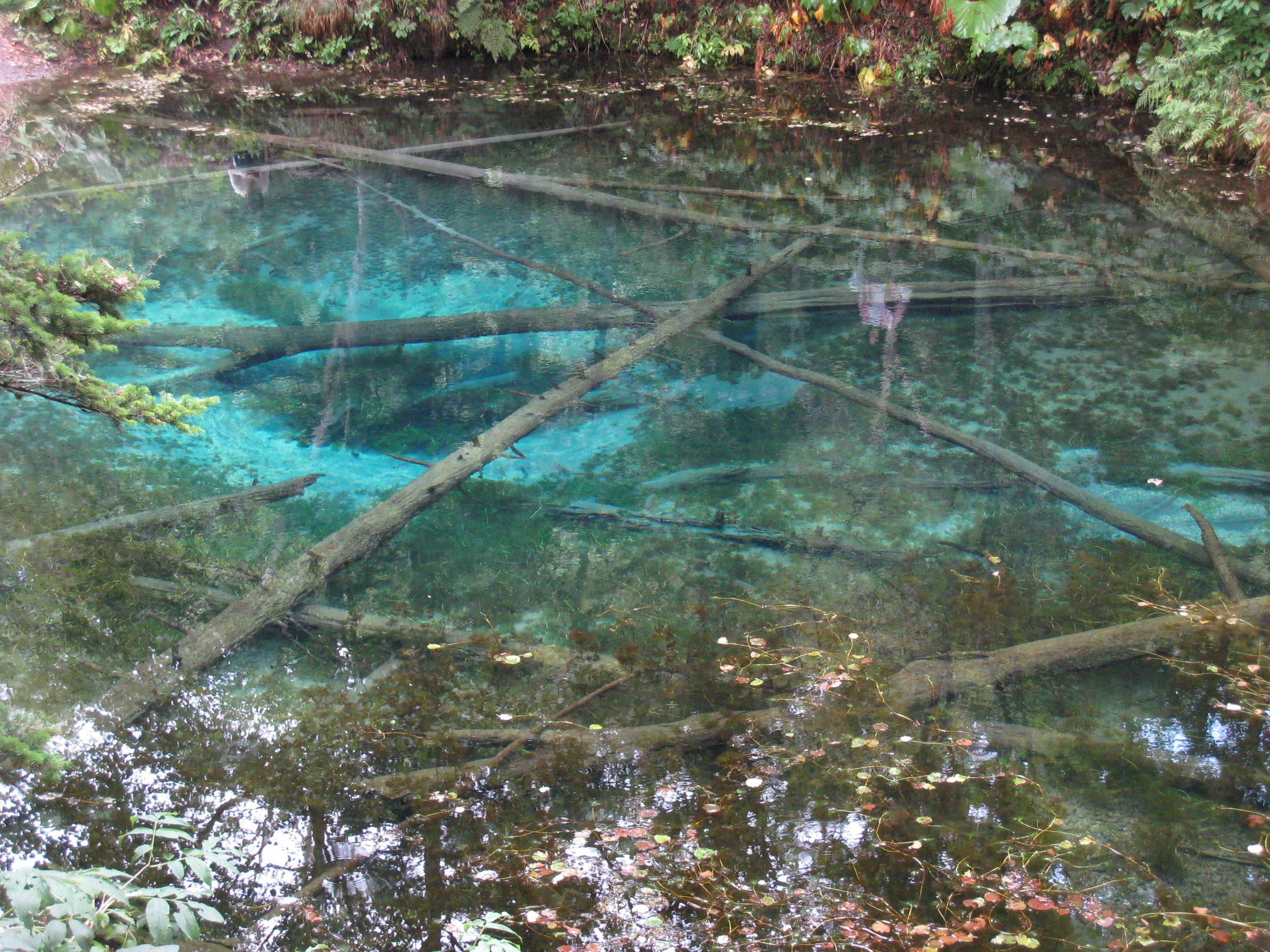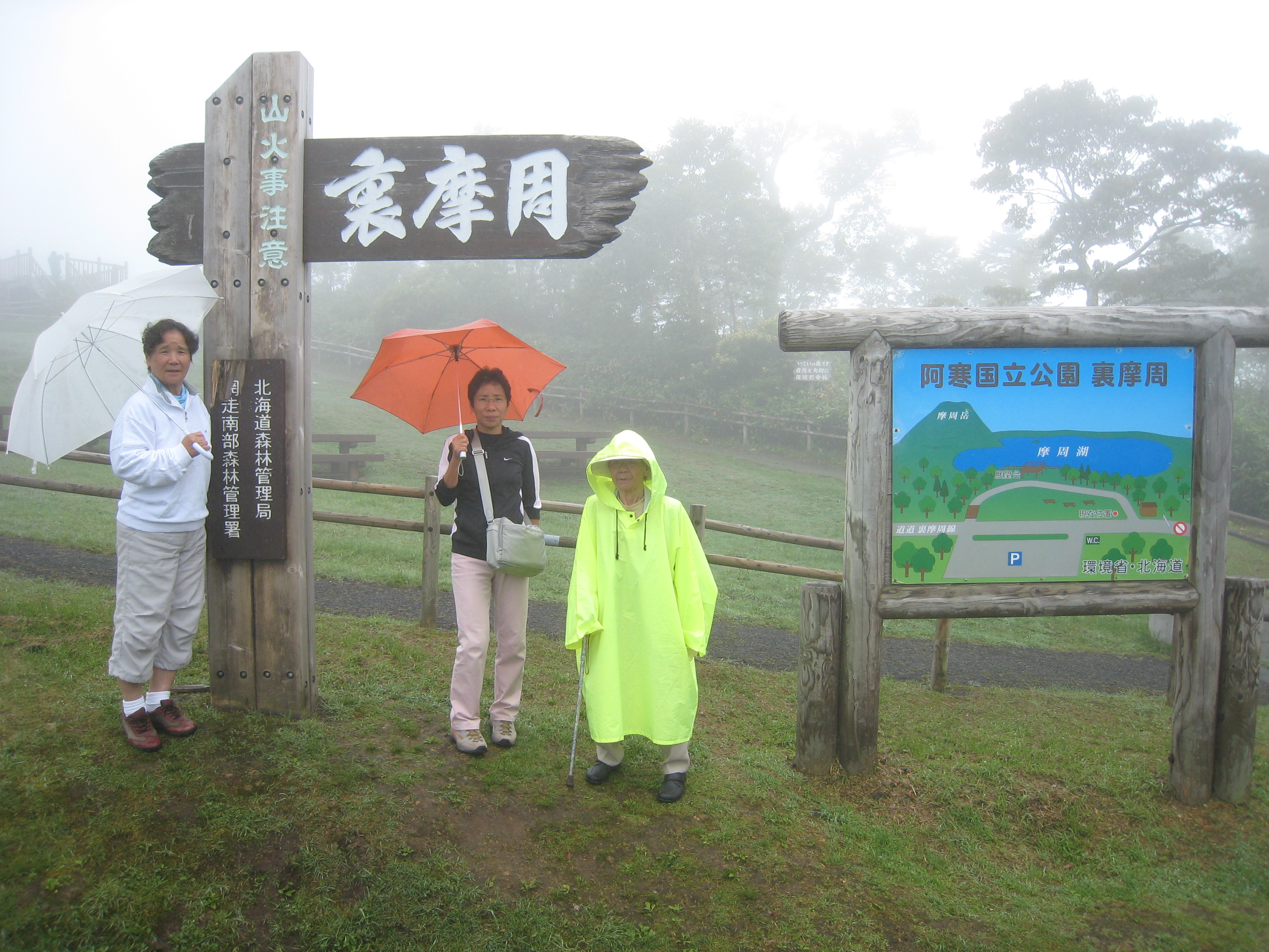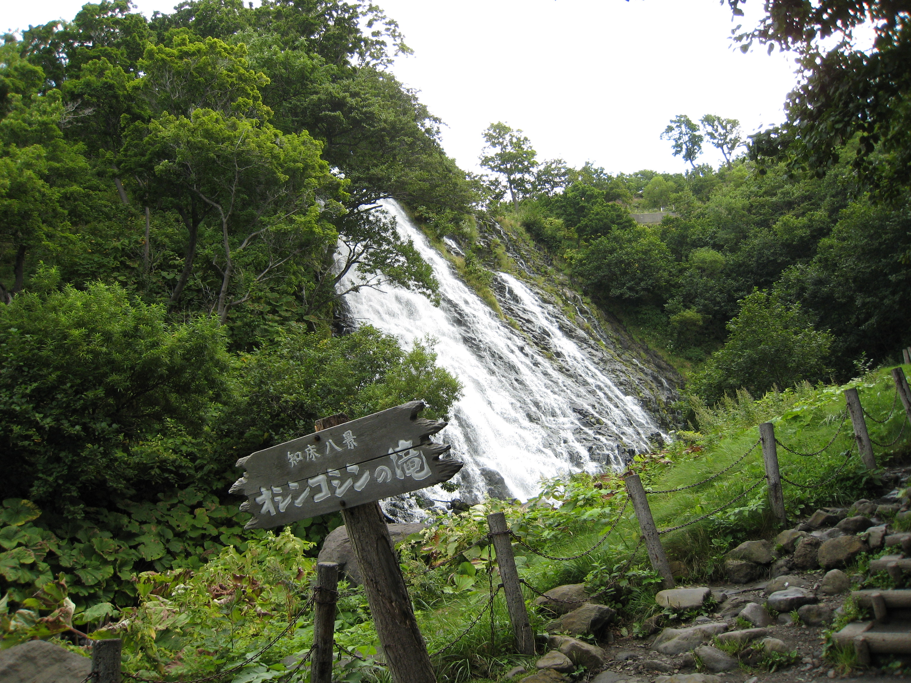 今日は摩周湖、屈斜路湖を経由して十勝川温泉に行く。ウトロから国道334号を暫く進むと、オシンコシンの滝がまず目に入る。この滝は、途中から流れが2つに分かれていることから「双美の滝」とも呼ばれている。滝の中ほどの高さまで階段で上がることができる。「日本の滝100選」に選ばれてる。そこから行ったことがない裏摩周展望台に向かう。国道334号 から道道1115号に入り、裏摩周展望台に行くが、降り出した雨で視界が悪く引返す。途中にあった神の子池まで戻る。この池は、摩周湖の地下水によってできたと言われている青い清水を湛える池で、周囲220m、水深5mの小さな池にも関わらず、伏流水は1日12,000tも湧き出している。水温が年間通して8℃と低く、倒木が青い水の中に腐らずに化石のように沈んでいる。