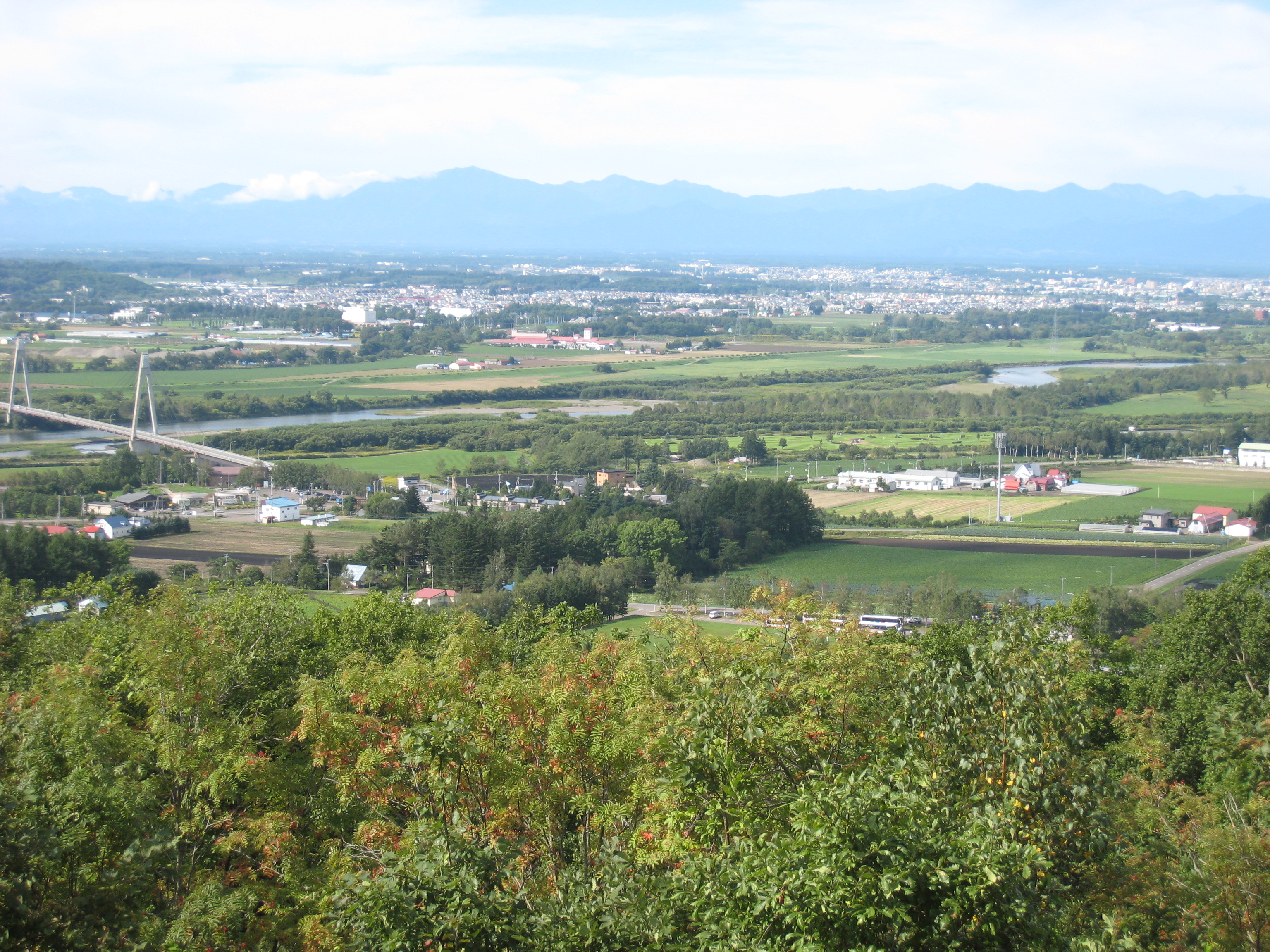 朝風呂に入り、朝食を済ませ、十勝川温泉のもう一つの見所である十勝が丘公園の花時計を見に行く。花時計ハナックは直径18m、秒針の長さ10.1mの大きさがあり、公園には広い芝生広場、源泉かけ流しの足湯等がある。その上の十勝が丘展望台からは、十勝川の背後に幌尻岳を擁する飛高山脈が連なる。