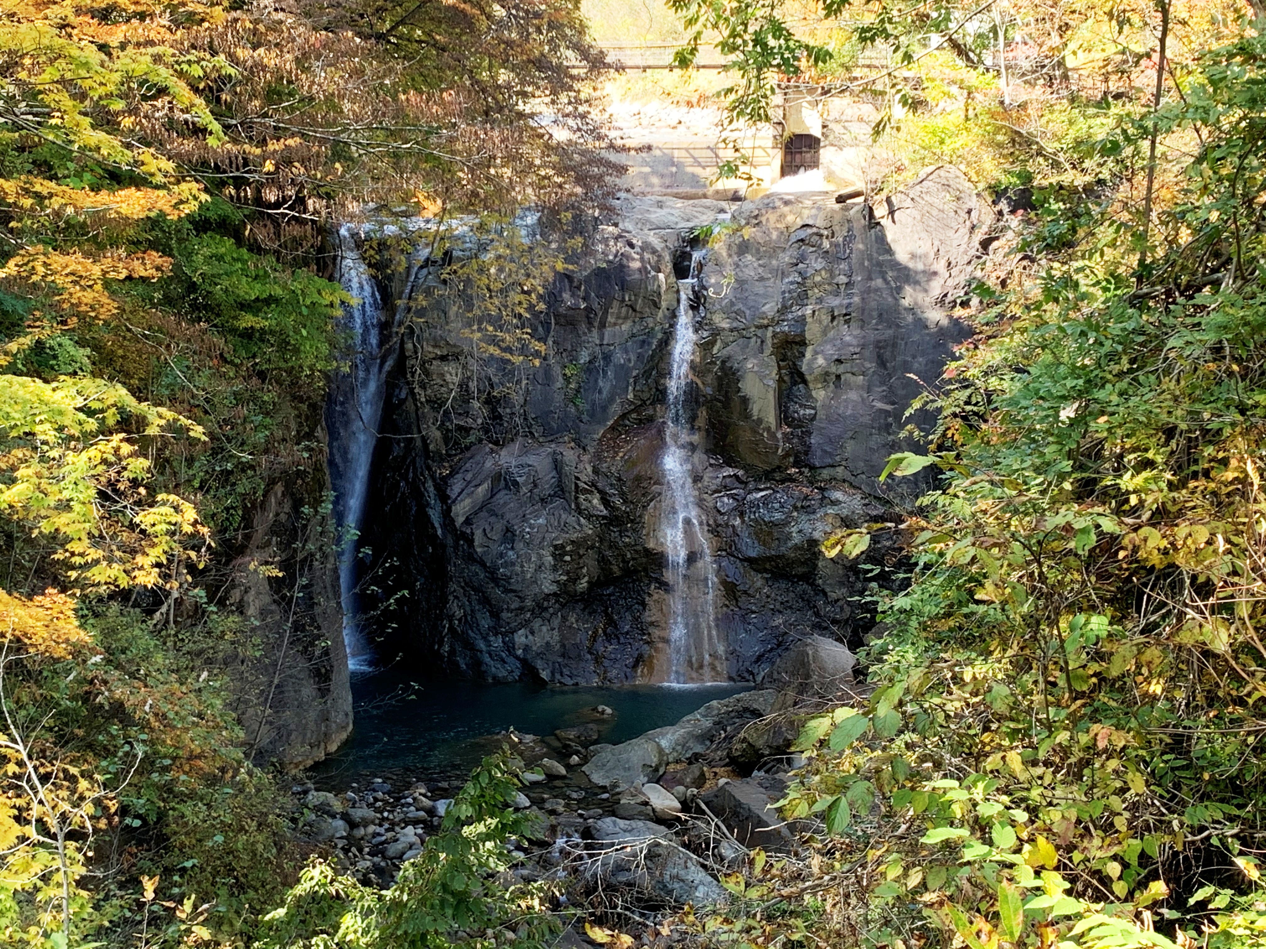 行者滝栗駒ダムと駒の湯温泉の中間にあり、高さ30mから2筋流れ落ちる。上流部の人工物が邪魔だ。