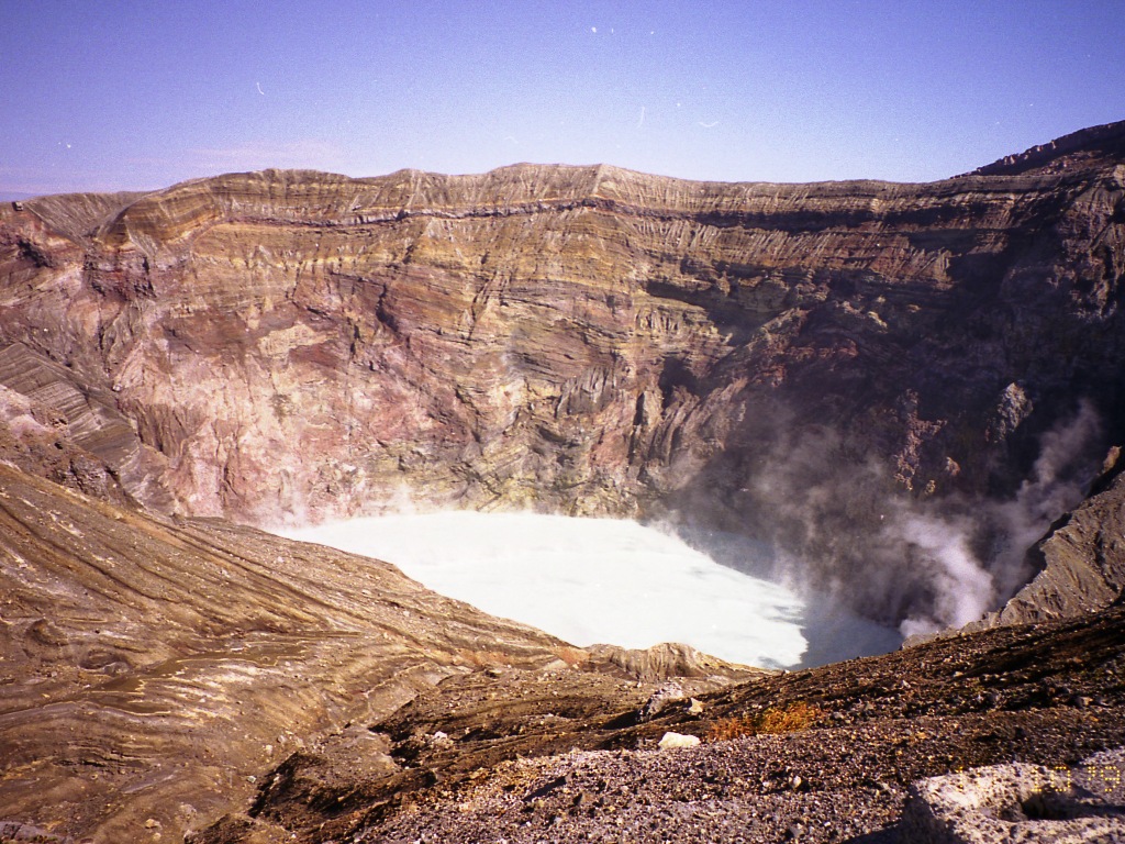 そこから、阿蘇山に近い草千里ケ浜に行き、遊歩道から阿蘇山を望む。最後にメインの阿蘇山火口に行く。阿蘇山上無料駐車場に駐車して、ロ-プウェーで阿蘇山西駅から火口西駅に向かう。中岳火口が見える阿蘇中岳火口展望所まで歩く。火口は水がたまり、白く光っていた。阿蘇中岳を背景に記念写真を撮る。近くに観光記念のパネルがあったので、そこでも写真に収まる。
