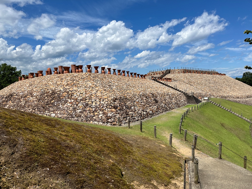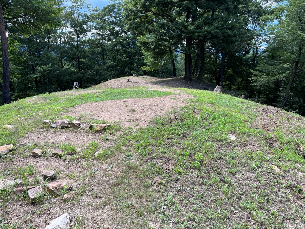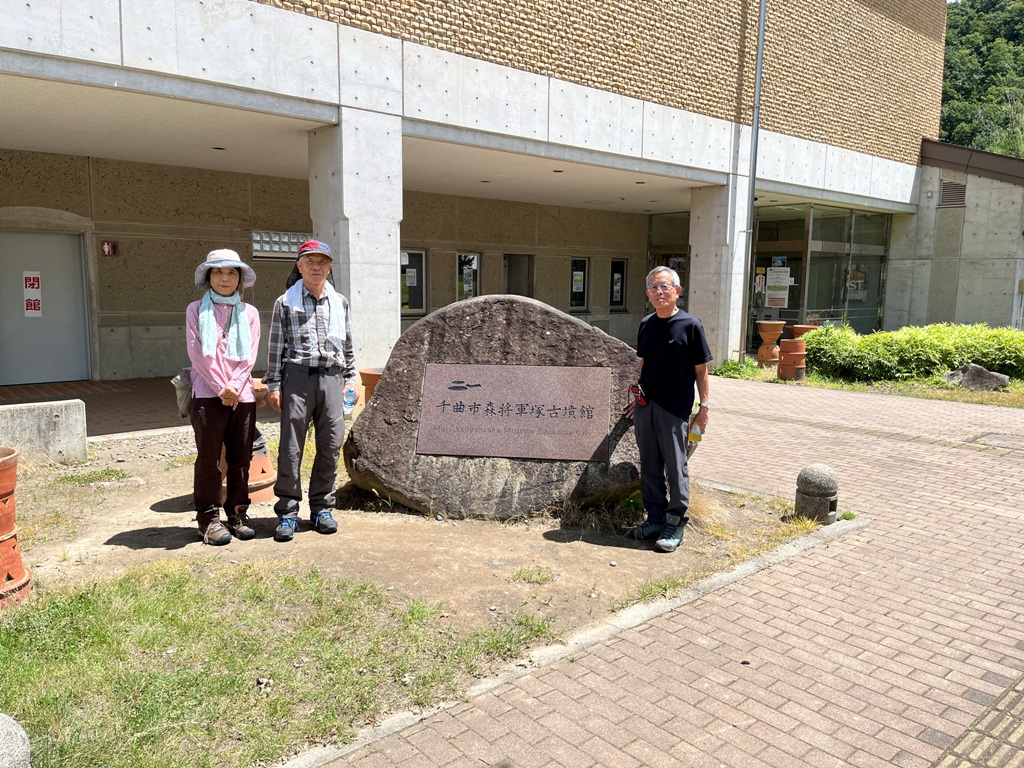 神奈川、大阪から松本駅に11時前に集合する。私が車で迎えに行き、松本駅を11時10分にスタ−トする。途中姨捨SAでヒル休憩を取る。最初の目的地の千曲市の森将軍塚古墳に12時40分に到着する。朝から蒸し暑い日で森将軍塚古墳古墳館は休館していたので、さっそくその裏山の大穴山にある森将軍塚古墳に向かう。途中にある円墳の森将軍塚2号墳を過ぎると直ぐに葺石で覆われた巨大な古墳が見える。