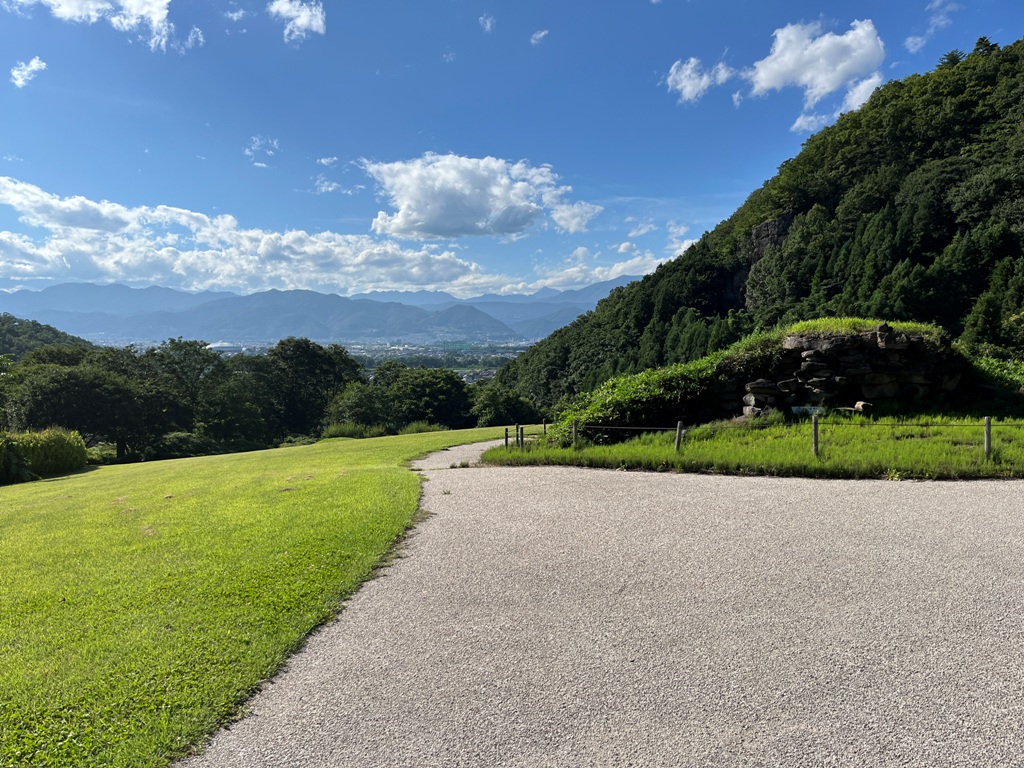 森将軍塚古墳は長野県で最大となる全長100mに及ぶ前方後円墳である。墳丘は葺石で覆われ、三重の埴輪列のほか、墳頂には形象埴輪が配されている。墳頂から善光寺平が一望出来る。一通り見学して、更に奥にある有明山森将軍塚古墳まで足を延ばす。汗びしょになり、森将軍塚古墳古墳館に戻る。