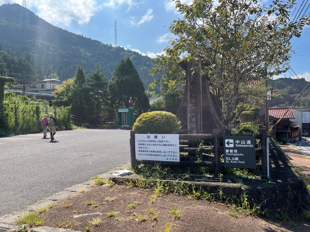 中央西線の小駅は便数が少ないので野尻駅まで車で行く。野尻駅の南木曽駅方面行は9時52分発で、それを逃すと12時21分まで待つことになる。どうしても9時52分発に間に合わせるために8時前に自宅を出発する。野尻駅は無料の駅前駐車場が広いので便利です。予定の列車に乗ると、案の定外国人の姿を散見する。南木曽駅で降りるとその人達も同じ方向に進んで行く。南木曽駅駐車場奥から入り、線路の跨線橋を越えて中山道にぶつかると、皆妻籠宿方向に右折した。三留野宿方向へ向かうのは私達だけとなった。与川道は外国人を良く見かけると聞いていたので拍子抜けがした。