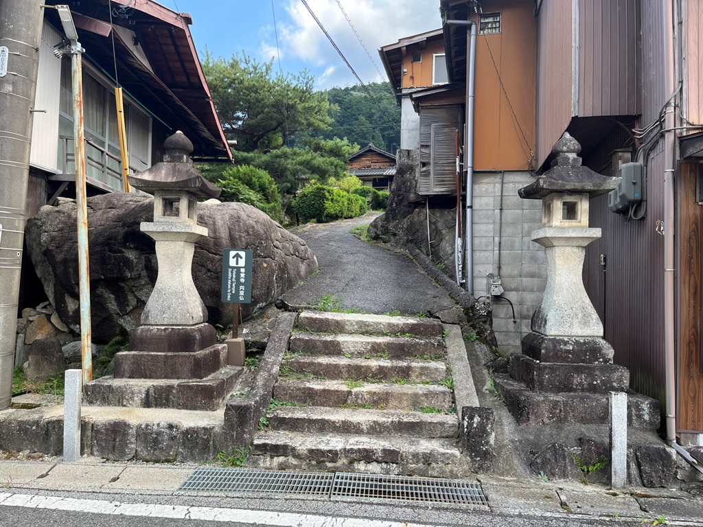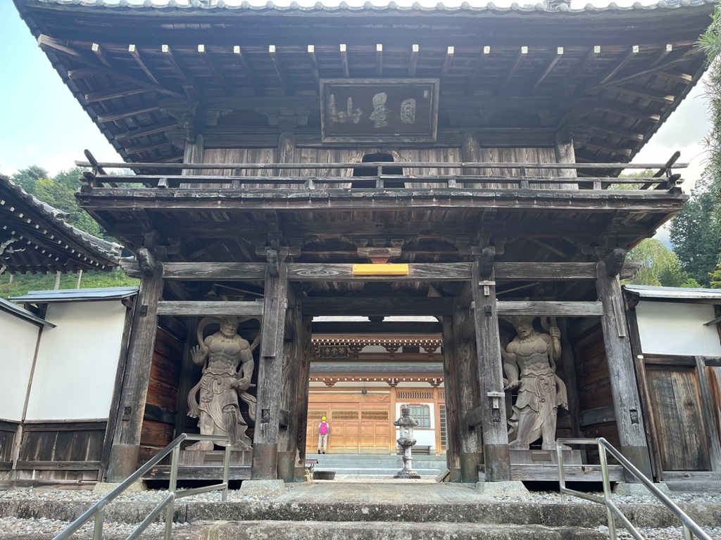 町史跡園原先生碑前を通過して10分程進むと、三留野宿入口に至る。そこから等覚寺に向かって上って行く。等覚寺は中仙道の三留野宿の曹洞宗の寺院です。禅宗の意匠が見られる山門と本堂がある。3体の円空仏は町の文化財に指定されている。そこから参道を三留野宿に向かって下って行く。