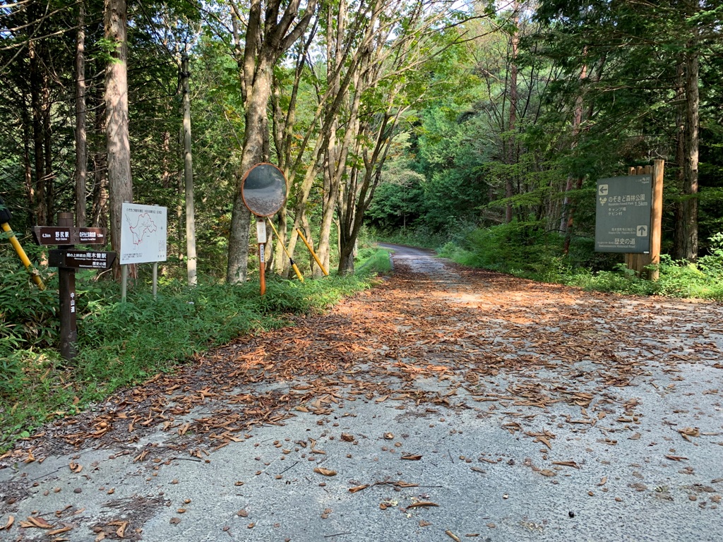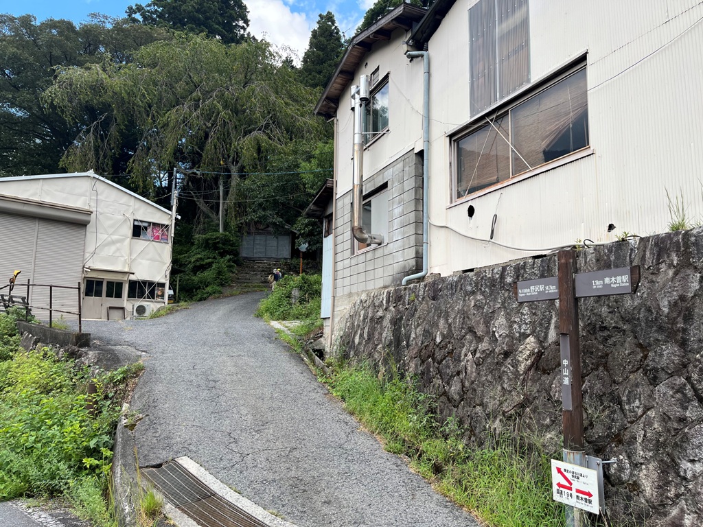 南木曽駅から2km地点から最初の山道に入っていく。野尻駅まで13.8kmの表示があるので、南木曽駅から野尻駅まで15.8kmの距離となる。石畳があり街道らしさを感じる。廿三夜塔前を抜けると再び林道に出る。ユースホステル前を通過して、キャンプ場から山道に入る。檜の樹林帯を5分程歩くと林道に出る。