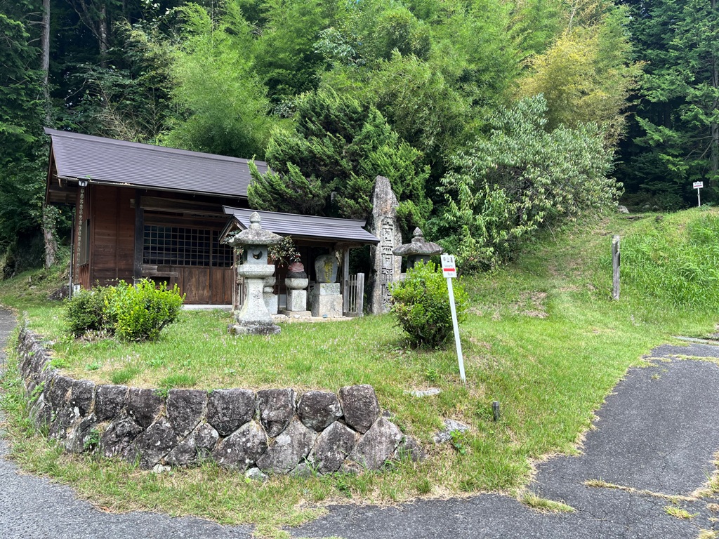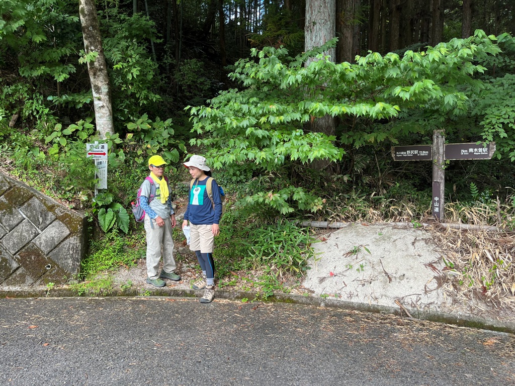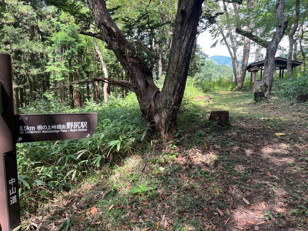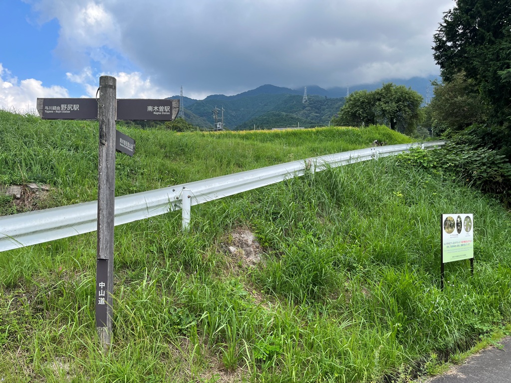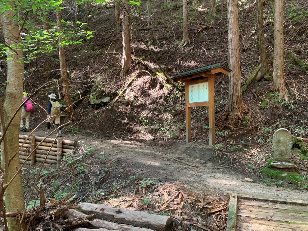 その直ぐ先に防獣柵があった。防獣柵を出た先の与川村庄屋屋敷付近で昼食を摂る。その先は路肩崩落で通行禁止となっていた。この集落には与川古典庵跡、大杉とかかぐらで有名な白山神社があるが素通りする。その先迂回路の指示に従い、民家の間を通り桧の林を抜けて松原御小休所跡の東屋に着く。ここから野尻駅まで根の上峠経由で8.5kmだ。行程の半分以上を歩いた距離となる。熊除け鈴を鳴らして桧林を暫く進むと、林道に出て橋手前を右に入る。橋の上に街道歩きのおじさんらしき人に暑いですねと声を掛けられる。道中出会った最初の人だった。
