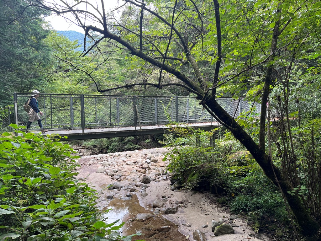 大奈良のバスのりば前を過ぎ、正善沢を超える。この先林道と山道を交互に繰り返す。川にはりっぱな橋が架かり、登山道の所々に木道が整備されている。標識の至る所に熊注意の看板が目につく。そのまさかのまさかに遭遇する。カーブした目と鼻の先に熊を認め、直ぐに後退して熊の死角に入る。熊はいなくなり事なきを得る。