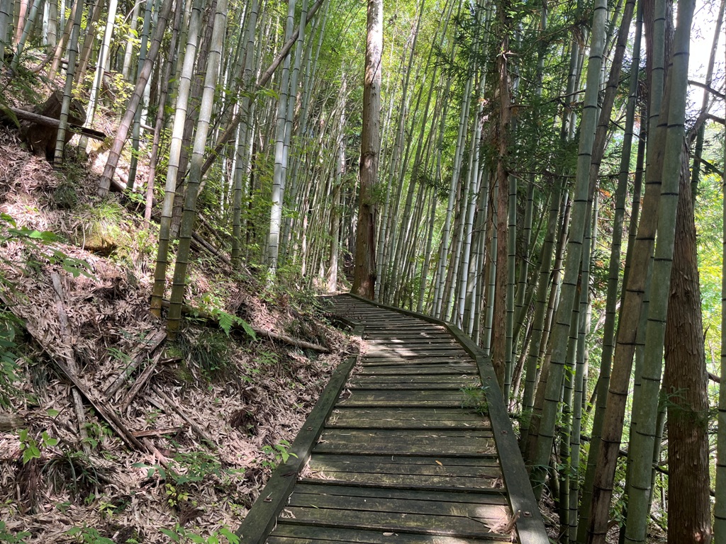 そこからは私道になり、両サイドが竹林の整備された登りの木道が5分間ほど続く。崩落地があり、迂回路の仮設階段を下りて正規コ-スに合流する。暫く進むと黄金色に輝く田んぼのある集落に出る。その一角に阿弥陀堂がある。