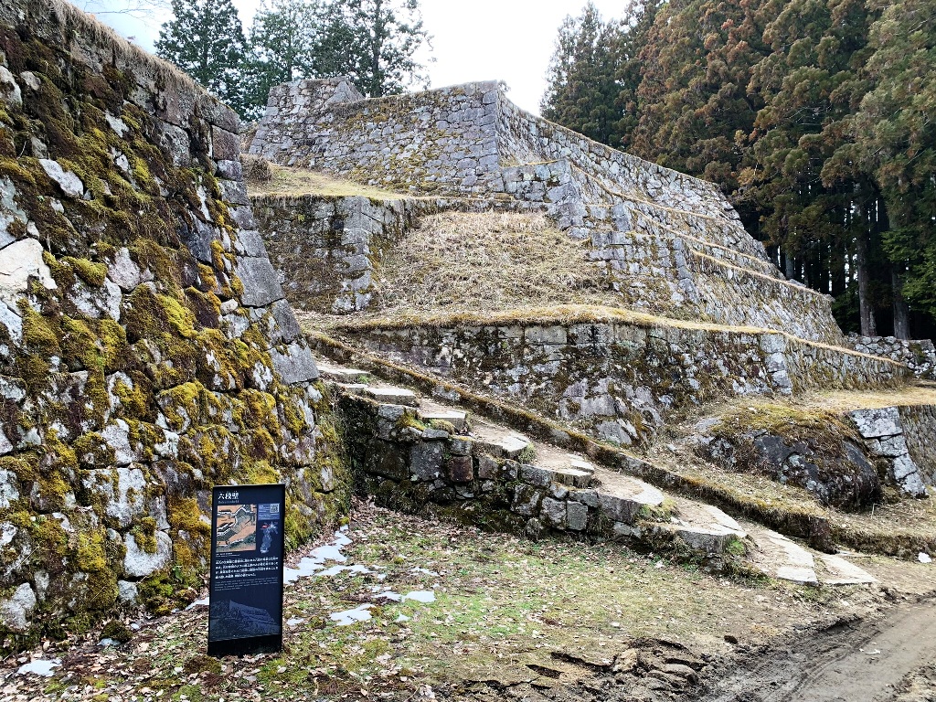 石垣が六段積みになっていることから、六段壁と呼ばれる。 急峻な地形に石積をする為に、工夫された石垣です。六段階の石垣の一階づつに犬走りを設けた工法で積まれ、修理や防御が想定されている。
