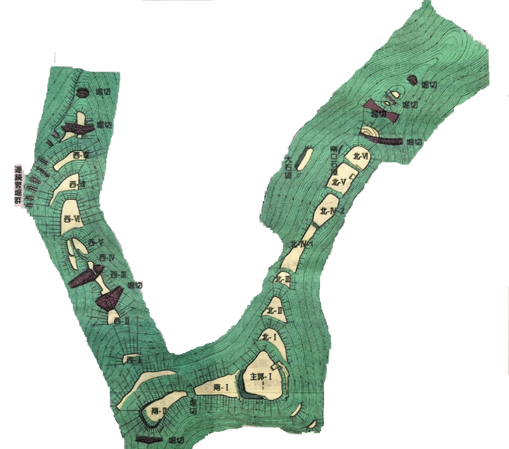 鎌刃城は、山頂部を削平して造られた平坦地に、土塁と石垣を築いて城郭を形成しています。主郭を中心に、北曲輪、南曲輪、西曲輪などの曲輪が配置され、各曲輪は堀切で区画されています。