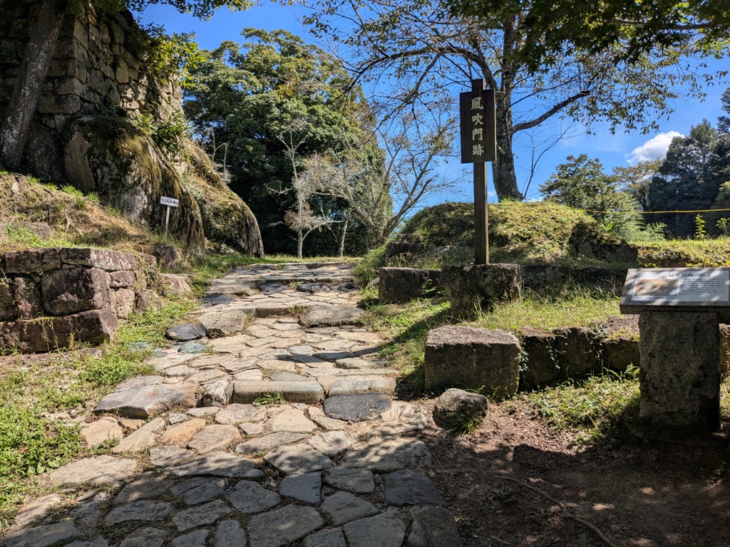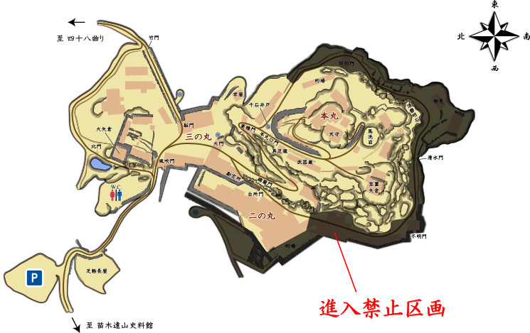 博物館手前の無料駐車場 ⇒ 大名、家臣団墓地 ⇒ 苗木遠山資料館 ⇒ 足軽長屋跡 ⇒ 風吹門跡 ⇒ 北門跡 ⇒ 大矢倉跡 ⇒ 三の丸 ⇒ 二の丸 ⇒ 大門跡 ⇒ 綿蔵門跡 ⇒ 城下門跡 ⇒ 菱櫓門跡 ⇒ 千国井戸、本丸口門跡 ⇒ 玄関口門跡 ⇒ 本丸玄関跡 ⇒ 本丸跡 ⇒ 天守建物