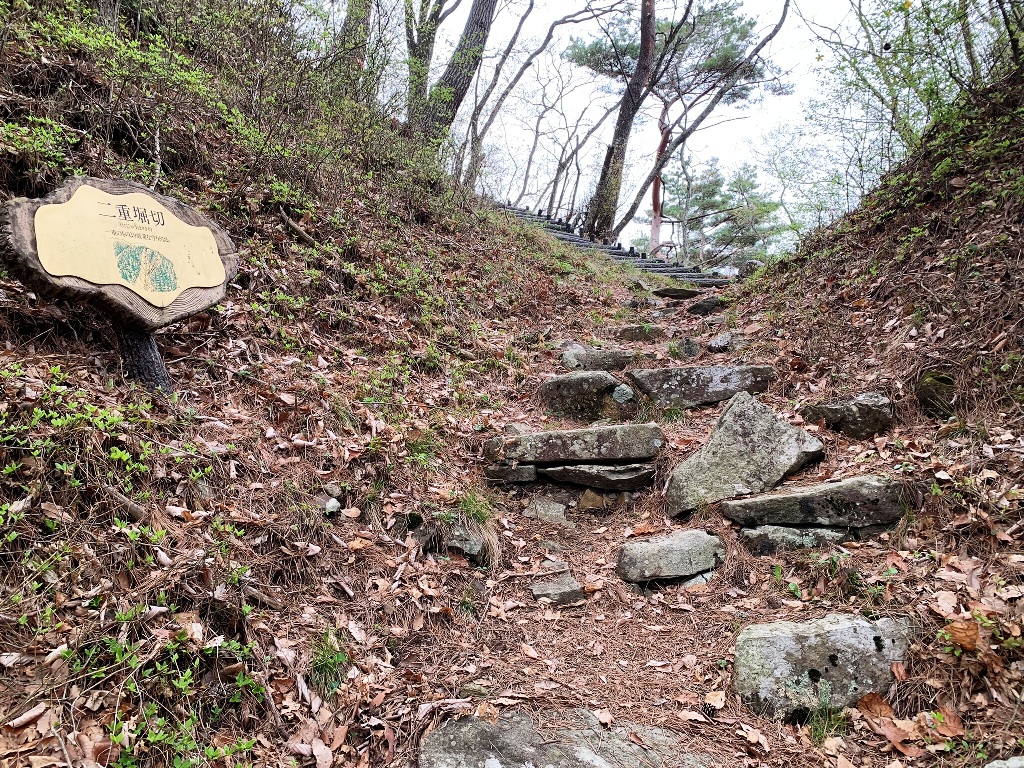 健脚ならば、青柳宿駐車場に駐車して、大切通し、清長寺を見学して1km程の古道を登ると冠木門に着く。そこから主郭に行き、尾根伝いに2の郭から5の郭を経て模擬櫓門に至る。そこから青柳宿までは舗装道路を、途中碩水寺に立ち寄り、徒歩で4kmを1時間半程かかる。私達は後者の周回コ-スを以下の順序で巡る。