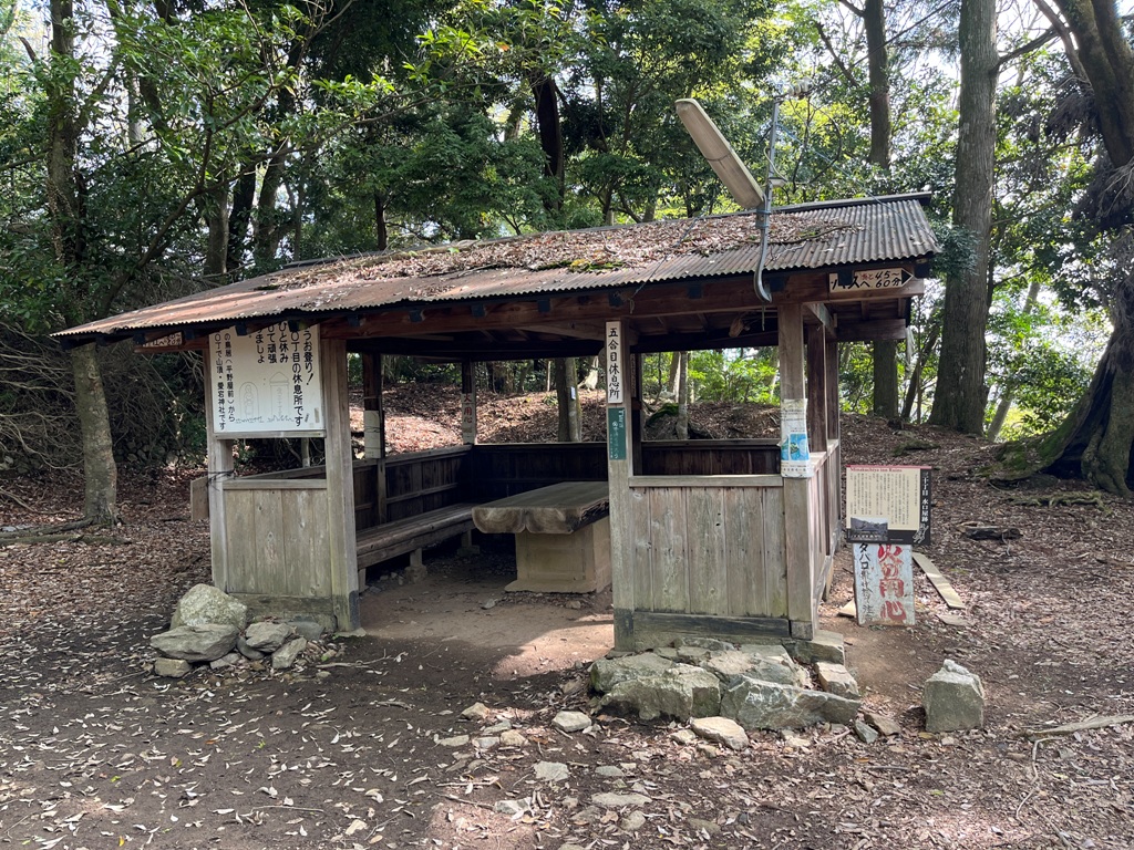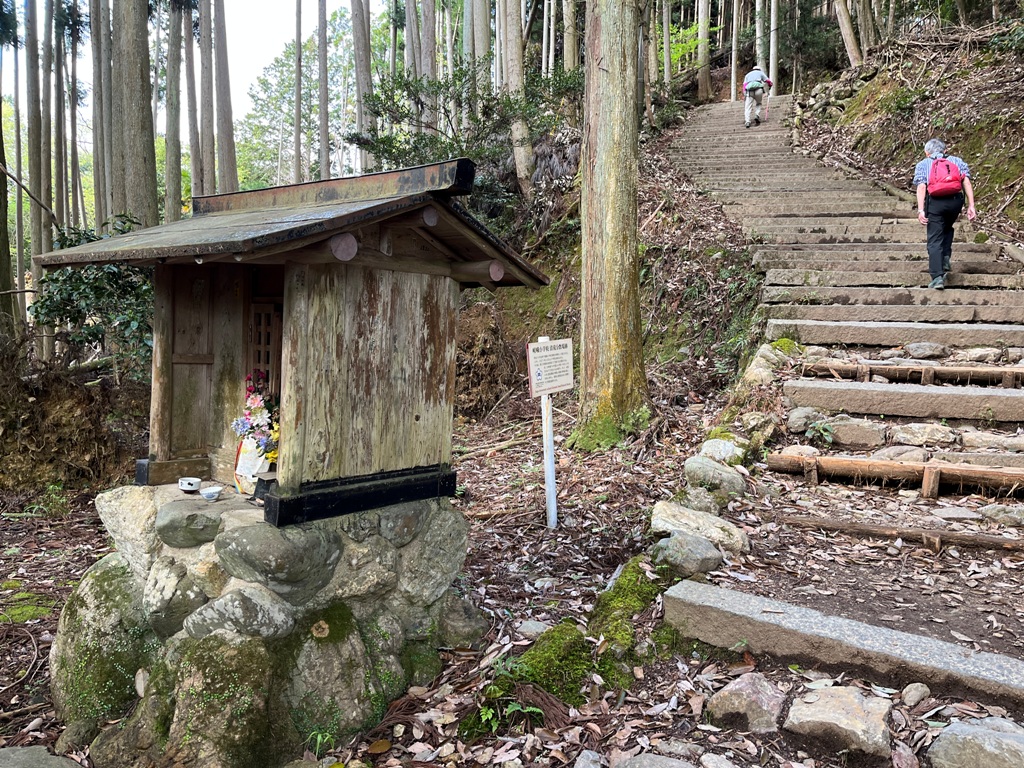 次に火燧権現跡があり、石碑に花が供えられていた。更にその先にだだ広い二十丁目一文字屋跡が続く。暫く急坂を登って行くと、「二十丁目です。・・・一の鳥居(平野屋前)から五十丁で山頂・愛宕神社です」なる看板があった。それを信じると既に4割方登ったことになる。茶屋跡には「二十五丁目ふかほ」と刻んだ石碑があり、説明文にこの場所がちょうど真ん中の二十五丁にあたると記している。そこに休憩所が設置されていた。そこから5分程上ると五合目休息所があり、そこに三十丁目水口屋敷跡の案内表示があった。その先に、先ほどの表示とは別に22/40とコメントが書かれた黄色い看板があった。