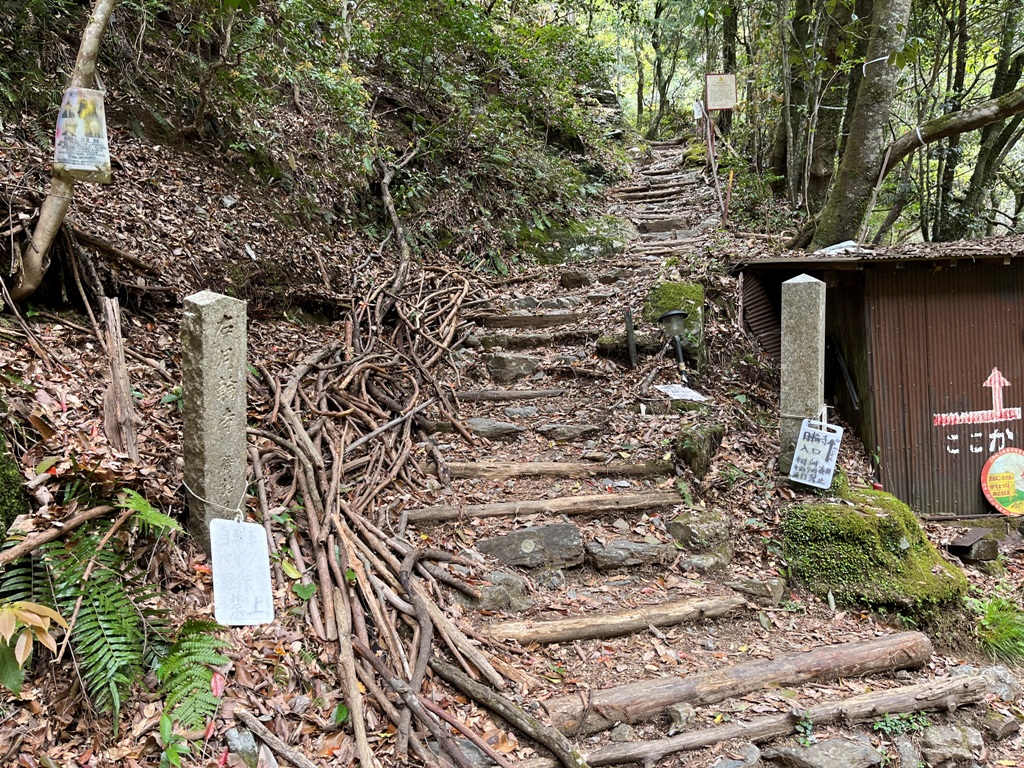 嵯峨嵐山駅から清滝には直通のバスがなく、嵯峨小学校前まで10分程歩く必要がある。バス便も少ないのでタクシ-で清滝バス停まで行く。そこから金鈴橋に向かって下っていく。金鈴橋を渡ると左に少し入った所に、朱色の二の鳥居がある。そこが愛宕神社参詣登山道入口で愛宕神社まで約4kmある。参道を上り始めると、右側にケーブルカ-の軌道が見えた。山麓から中腹までケーブルカーがあったようだ。参道を10分程歩くと、まず嵯峨小学校清滝分教場跡が目に入る。そこから急坂の石段が続く。