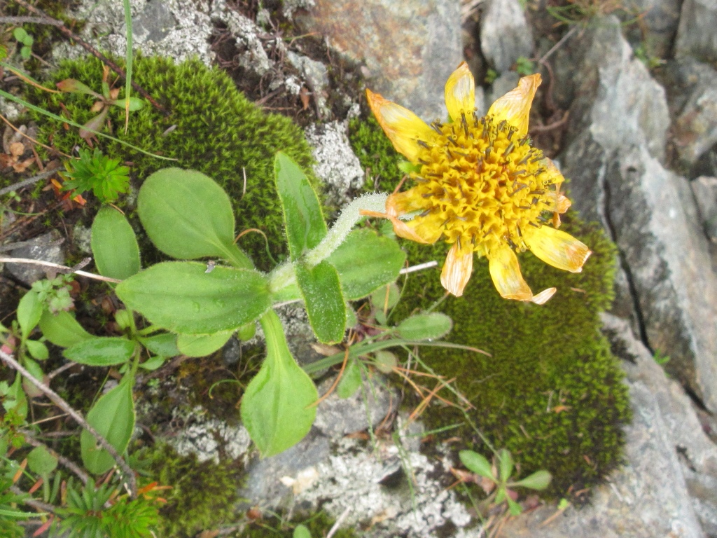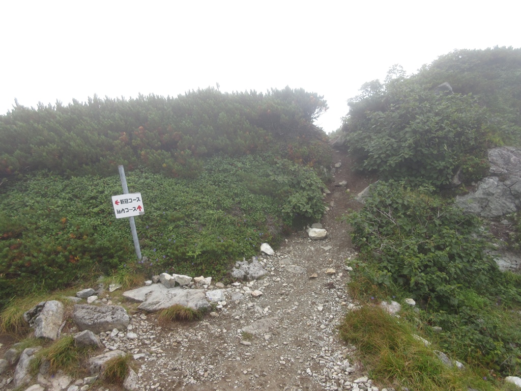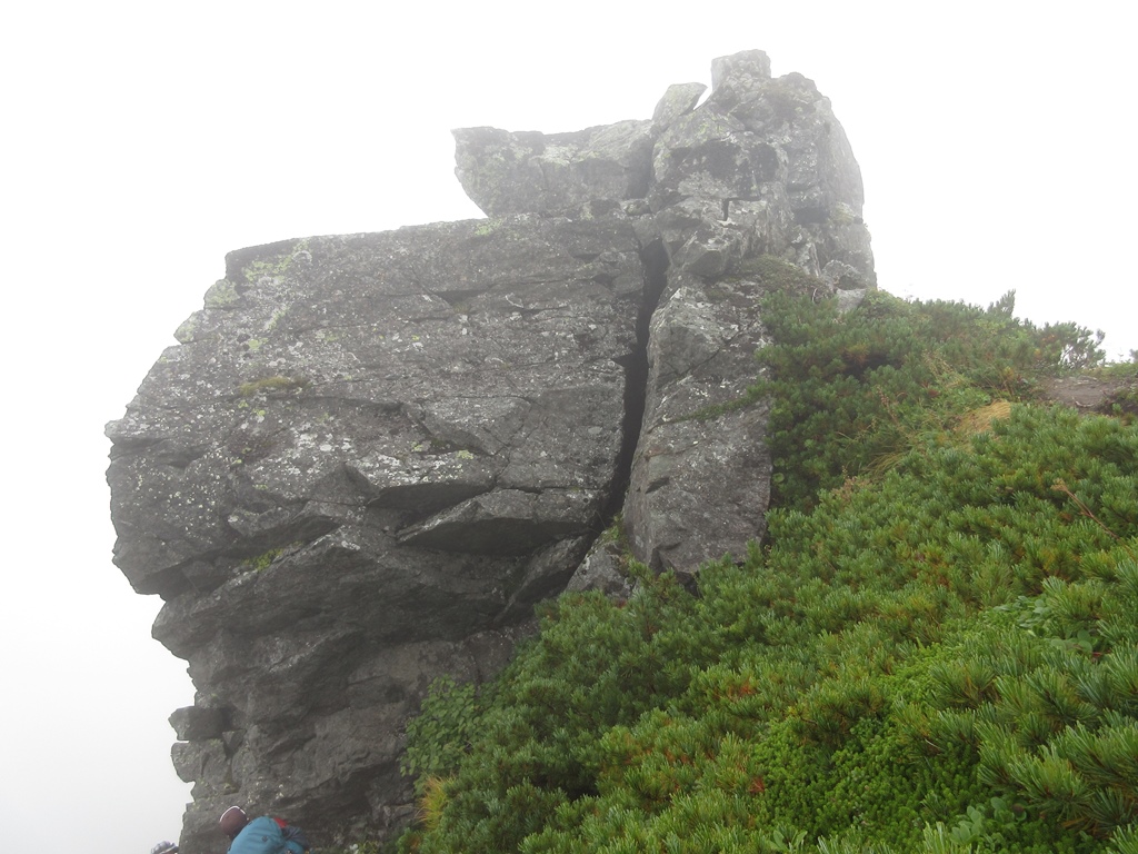 大岩には水場から1時間で着く。10分程休憩して、ハイマツ帯を登りつめると、振内・新冠コ-ス分岐に達する。そこから山頂までは10分だ。幌尻岳山頂(2,052.8m)はガスで覆われ、視界は全くない。風が強く吹き飛ばされそうだ。体感温度は低く、手が痛くなる。登頂証明写真を撮ると、早々に下山開始する。天気がよければ、肩まで行くつもりだったが、今日はその選択肢は無い。大岩まで急いで引き返し、その岩陰で昼食を摂る。下りは時間に余裕があるので、膝を傷めないよう小まめに少休止をする。高山植物も丁寧に観察する。山頂から大岩まで15分、水場まで2時間(大岩休憩50分含む)、見晴台まで3時間、渡渉点まで4時間を要す。そこから巻道を1時間歩いた15時4分にポロシリ避難小屋に到着する。今日も避難小屋は満員だ。小屋の外では登山者の夕食が始まっていた。我々も、寝床を確保して、夕食の支度にかかる。おかゆ、カップヌ-ドルとソ-セ-ジ等の簡単な食材で直ぐに食べ終える。ビ-ルが飲みたーい。することが無いので、早々にシュラフに包まる。
