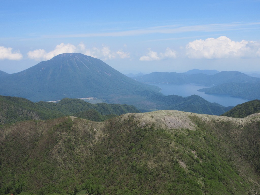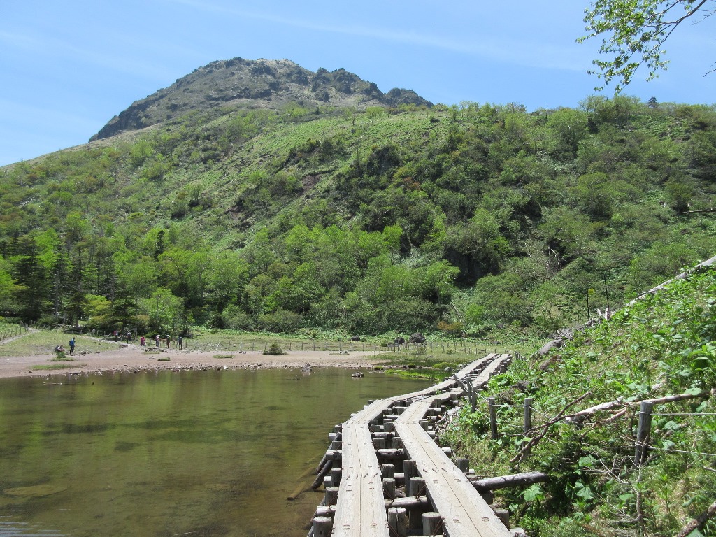 12時46分に下山を開始する。頂上直下の祠の前を通り、しばらくガラ場の稜線を進む。その付近から男体山と中禅寺湖が眼下に大きく見える。左側の鞍部にはまだ僅か雪が残っている。さらに進むと、急坂の下りとなる。下山路は団体の登山客が、ゆっくりペ-スで進むので時間がかかる。五色沼避難小屋まで48分、五色沼まで1時間4分かかる。五色沼避難小屋前は、学生らしき集団がたむろしていた。幸いこの集団は、前白根山方向に向かう。五色沼で昼食タイムとする。弥陀ヶ池まで上り返すのは、気分的にいやだ。白根山・五色沼分岐から日光白根山登山口まで1時間14分もかかり、復路も往路と同様中間付近で時間を要した。結果、往路2時間41分、復路3時間10分の山行だった。