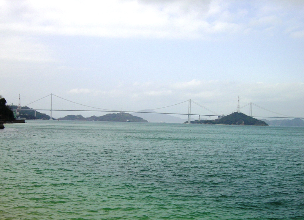 三つの吊り橋が連続する構造は世界的にも珍しく、第一大橋(大島側)・第二大橋(武志島側)・第三大橋(今治側)が一体となって約4キロに及ぶ壮大な景観を形成している。白い主塔とゆるやかなケーブルの曲線は、瀬戸内海の多島美と調和し、海上を滑るように延びる姿が印象的である。