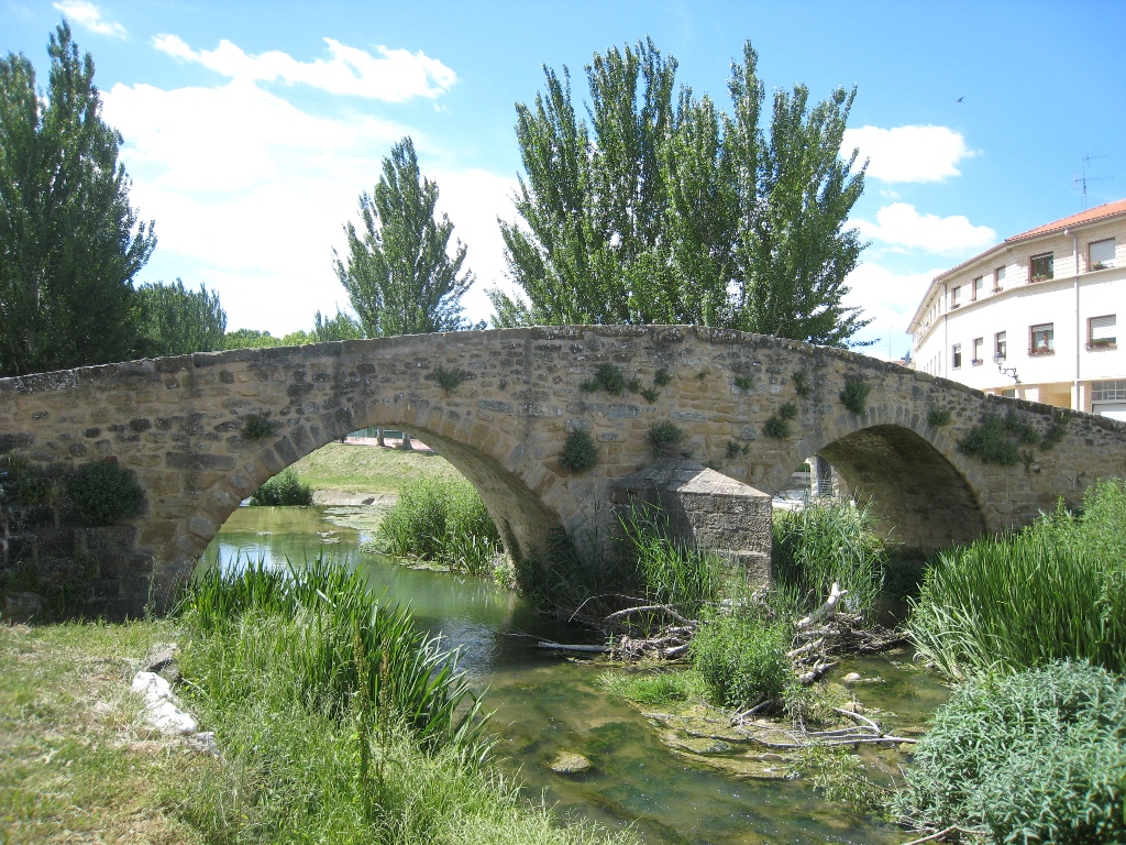 橋は三連のアーチから成り、厚みのある切石積みと緩やかな勾配が特徴である。欄干は低く、石畳の路面には長年の通行で生じた摩耗の跡が残り、幾世紀にもわたる巡礼者の足取りを感じさせる。中世にはこの地点に巡礼宿や施療院が置かれ、旅人は川を渡った後に休息と食事を得たという記録がある。現在も橋のたもとには古い教会や伝統家屋が並び、ナバーラ農村の静かな景観と調和している。