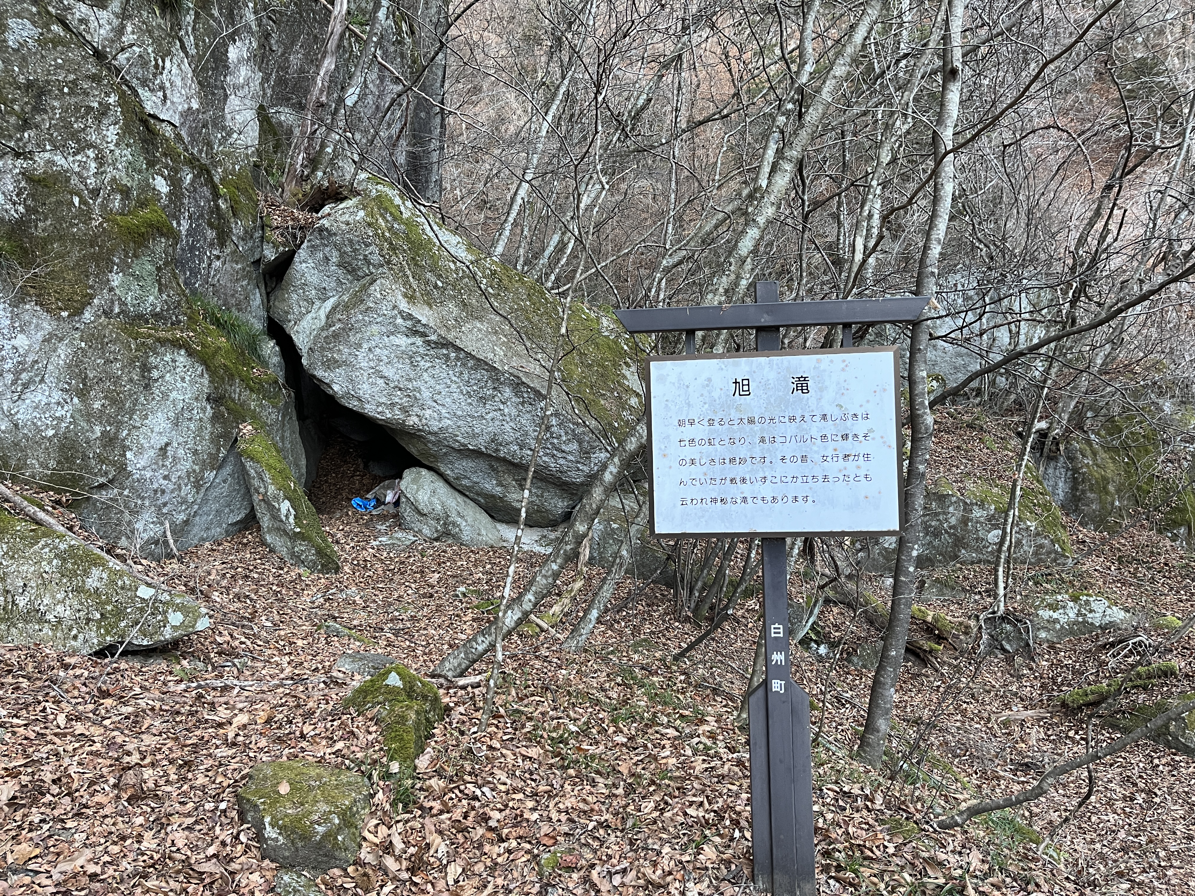 旭滝は朝早く登ると太陽の光に映えて滝しぶきは七色の虹となり、滝はコバルト色に輝く。その昔、女行者が住んでいたと言われる神秘な滝です。旭滝は正面大岩の背後にあって見えない。