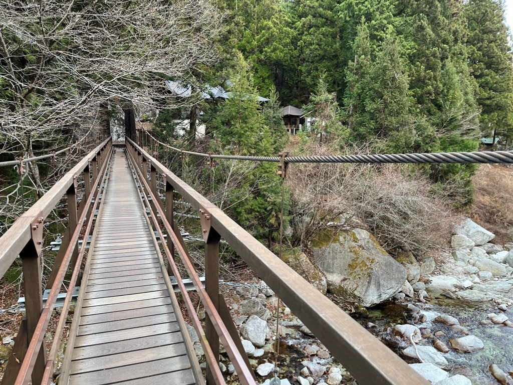 竹宇駒ヶ岳神社を抜けた先にあり、尾白川に架かるその吊橋を渡ると、遊歩道は渓谷道と尾根道に分かれる。