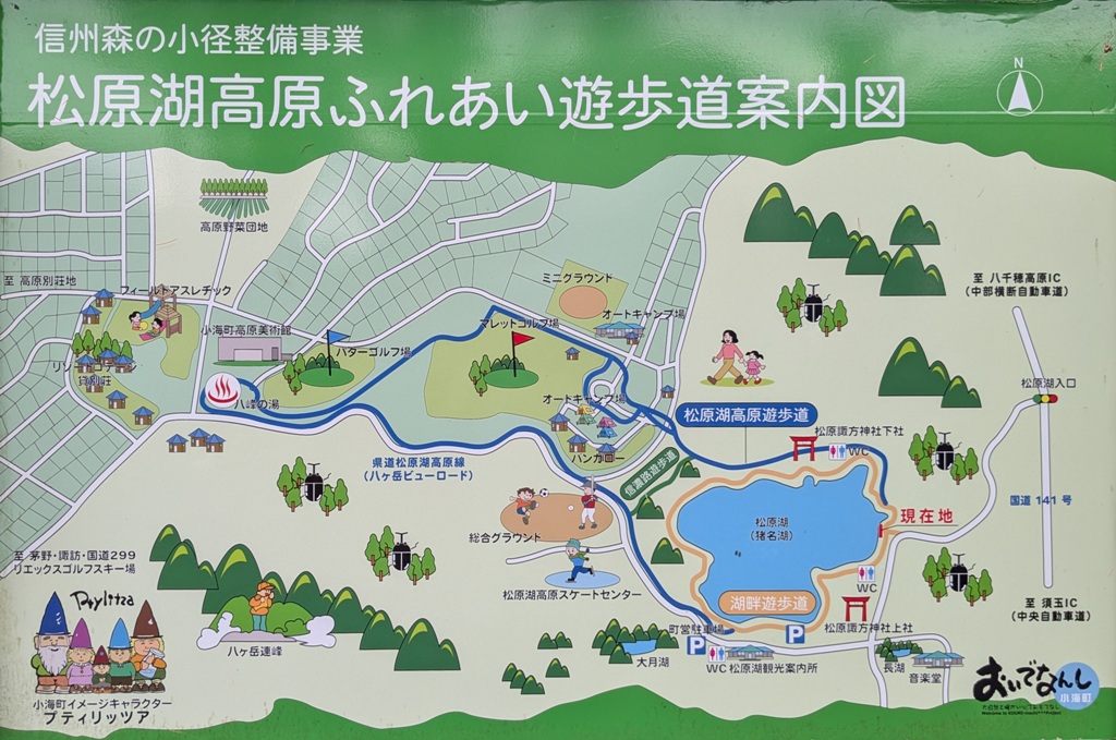湖周辺には約1kmの遊歩道が整備されており、四季折々の自然を楽しみながら散策することができます。特に秋の紅葉は見事で、湖面に映る八ヶ岳連峰の景色と相まって、訪れる人々を魅了します。春から夏にかけてはヘラブナ釣り、冬にはワカサギ釣りが盛んで、釣り人にも人気のスポットです。