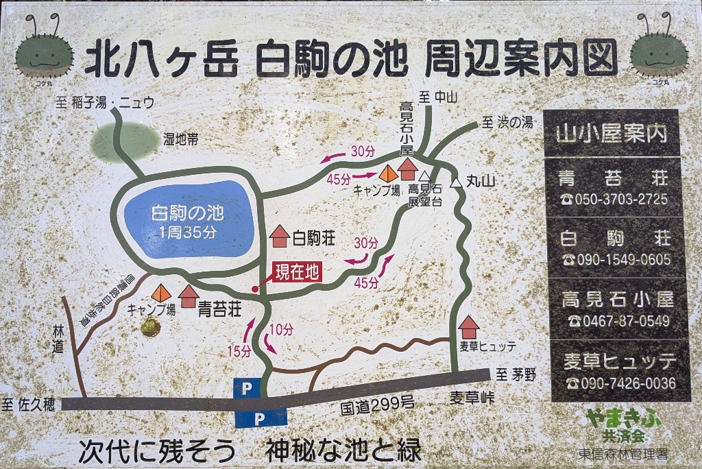 中部横断自動車道の八千穂高原ICから車で約30分で着く。国道299号線(通称メルヘン街道)沿いにある白駒池駐車場から徒歩約15分です。駐車場は有料で、普通車約160台分のスペースがあるが人気のスポットですぐ満車になるので注意です。➠ Map