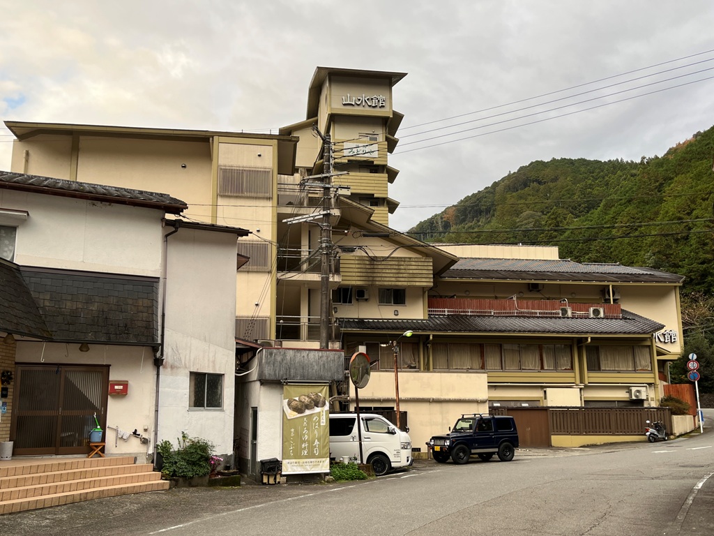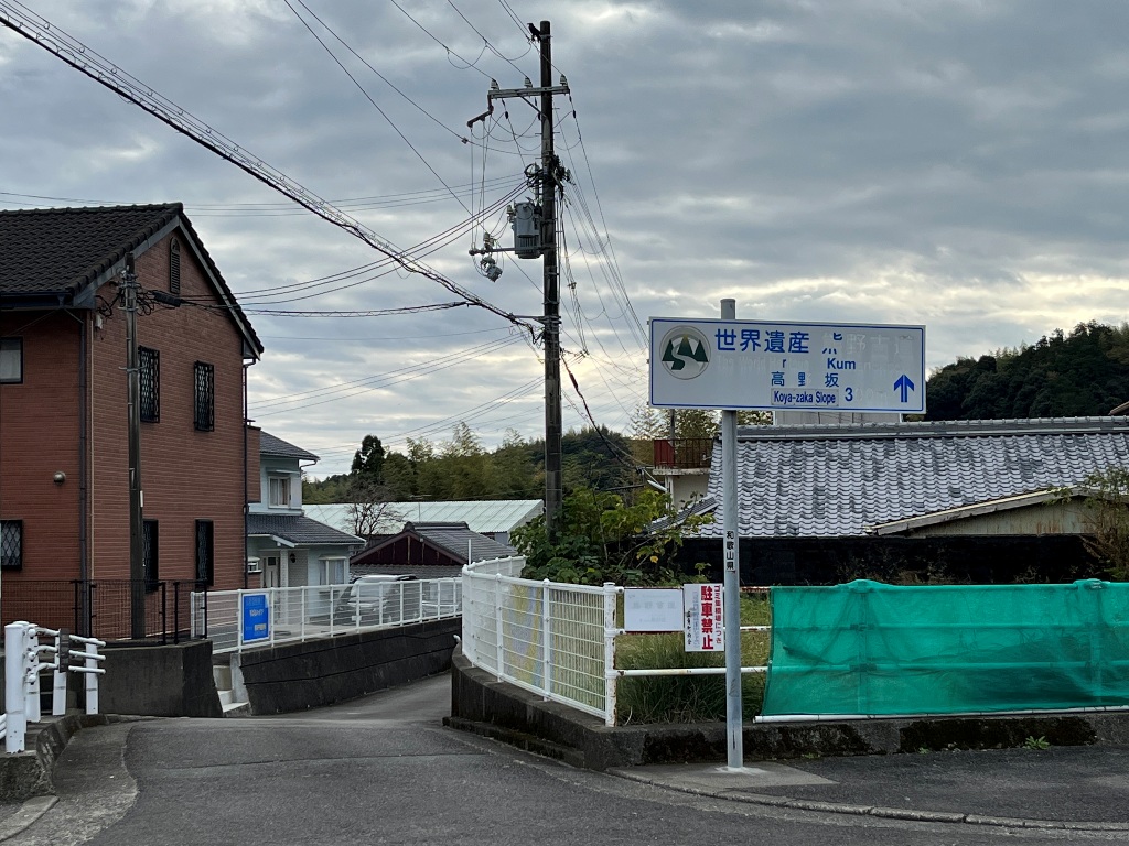 鯨山見跡分岐に戻り、再び高野坂を歩き始める。そこから両側には畑の石垣があり、石畳の坂道が続く。15分程で高野坂(三輪崎)の道路上に出る。熊野荒坂津神社下に待機していたバスに乗り、今夜の宿の川湯温泉山水館川湯まつやに向かう。宿泊は川湯まつやで、夕食と温泉は隣の川湯みどりやとなっている。2022年12月5日(月) 曇りのち雨
