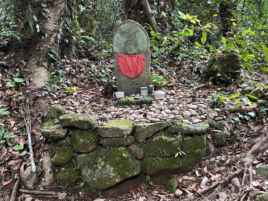 さらに進むと、目印になる石像がひっそり佇んでいる。入口から30分で鯨山見跡分岐に達する。左に折れ鯨山見跡まで往復する。途中金光稲荷神社まで95mの道標があったが立ち寄らなかった。そこには鯨に関わる羽指中建立の石祠がある。また季節外れの花が沢山咲いていた。鯨山見跡は日本遺産に登録されているが、海が見渡せる展望台といった感じだ。