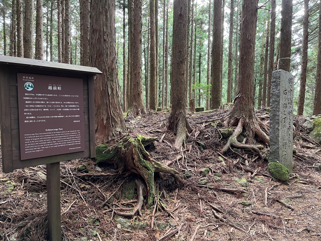 やがて古道はフラットになり、両サイドは苔で覆われた大木が続く。その先に標高870mの越前峠がある。越前峠が中辺路の最高所となる。小口から標高差800m程を登ったことになる。案内板の横に土屋文明の歌碑がある。見晴らしがないので、一息いれるとまもなく滑り易い急坂を下っていく。直ぐに道標20があり、残りはまだ10kmある。越前茶屋跡の石段を登り左に折れる。その先の林道の合流点から急坂をひと上りすると石倉峠だ。