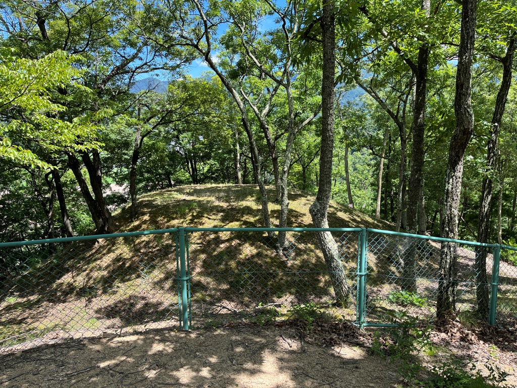 神奈川、大阪から松本駅に11時前に集合する。私が車で迎えに行き、松本駅を11時10分にスタ−トする。途中姨捨SAでヒル休憩を取る。最初の目的地の千曲市の森将軍塚古墳に12時40分に到着する。朝から蒸し暑い日で森将軍塚古墳古墳館は休館していたので、さっそくその裏山の大穴山にある森将軍塚古墳に向かう。途中にある円墳の森将軍塚2号墳を過ぎると直ぐに葺石で覆われた巨大な古墳が見える。