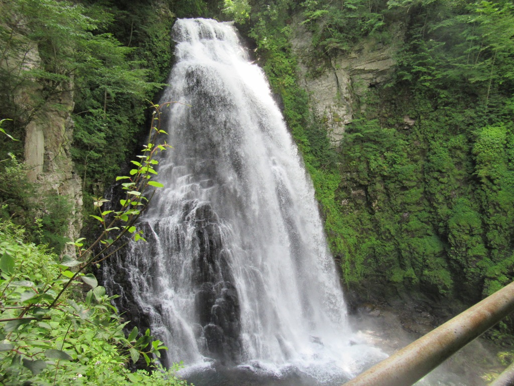 今日はすっかり雨はあがり、乗鞍岳には雲がかかっているが良い天気だ。私は体調が完全に戻らないため、運転手に徹する。休暇村乗鞍高原を8時33分に出発する。先ず三本滝の駐車場に直行する。私は車で待機する。全員揃って40分程で帰って来る。三本滝は駐車場から20分程の場所にあり、行きはよいよいの下り坂です。吊り橋が見えたら、三本滝は直ぐ傍です。吊り橋を渡って少し上った所に、三本滝の狭い展望所があります。全員で展望所に上り、しばし三本滝の迫力に目を見張る。三本滝はその名の通り、三本の滝の総称です。向かって右から、黒沢の滝、小大野川の本流の本沢の滝、無名の滝です。